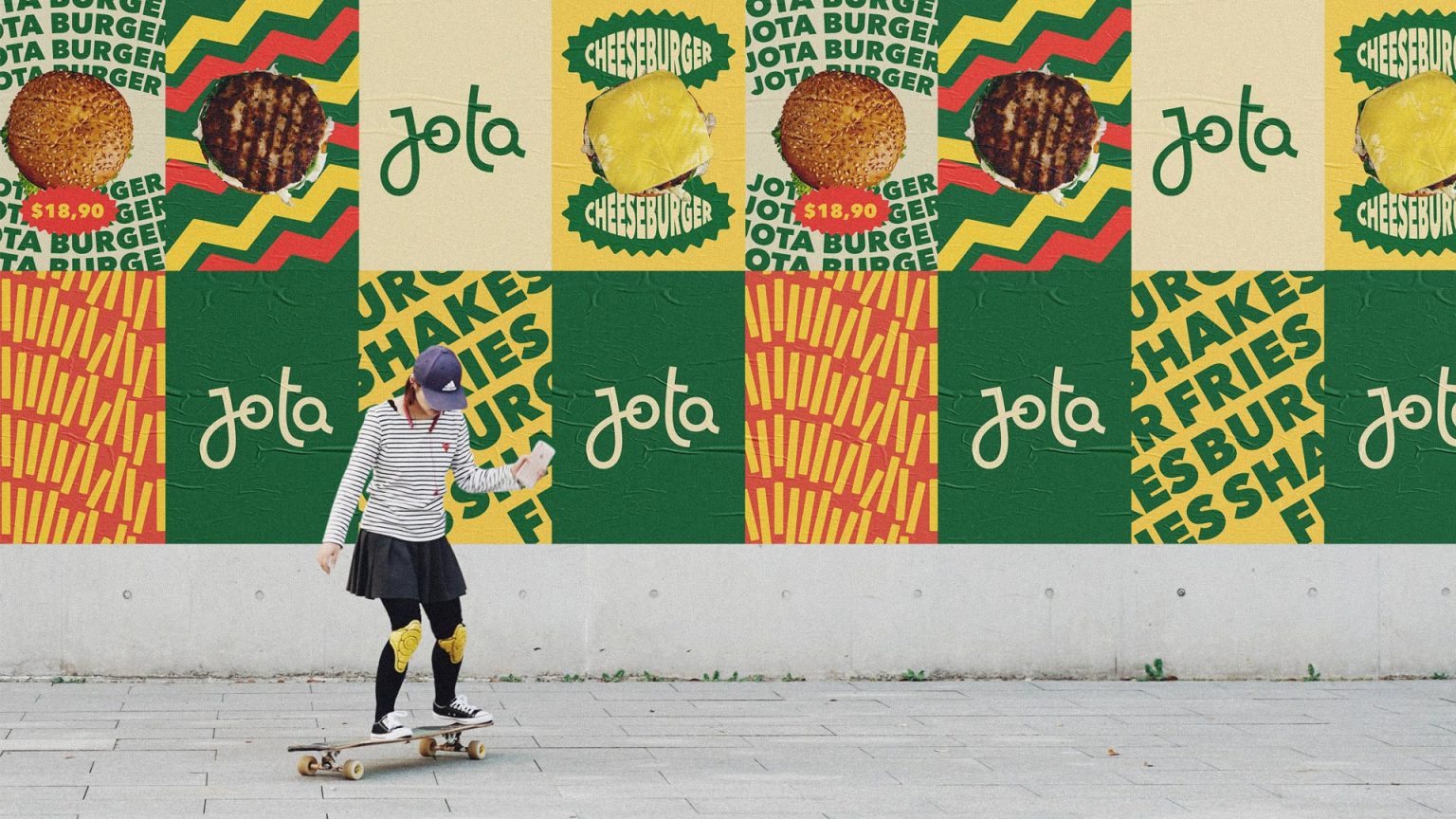 Além da cor predominantemente verde, outro destaque são os adesivos para identificação dos lanches. Enquanto muitos restaurantes identificam seus produtos com caneta, Jota conta com adesivos para marcar qual é o tipo do lanche, e cada um tem uma forma proprietária que facilita a identificação.